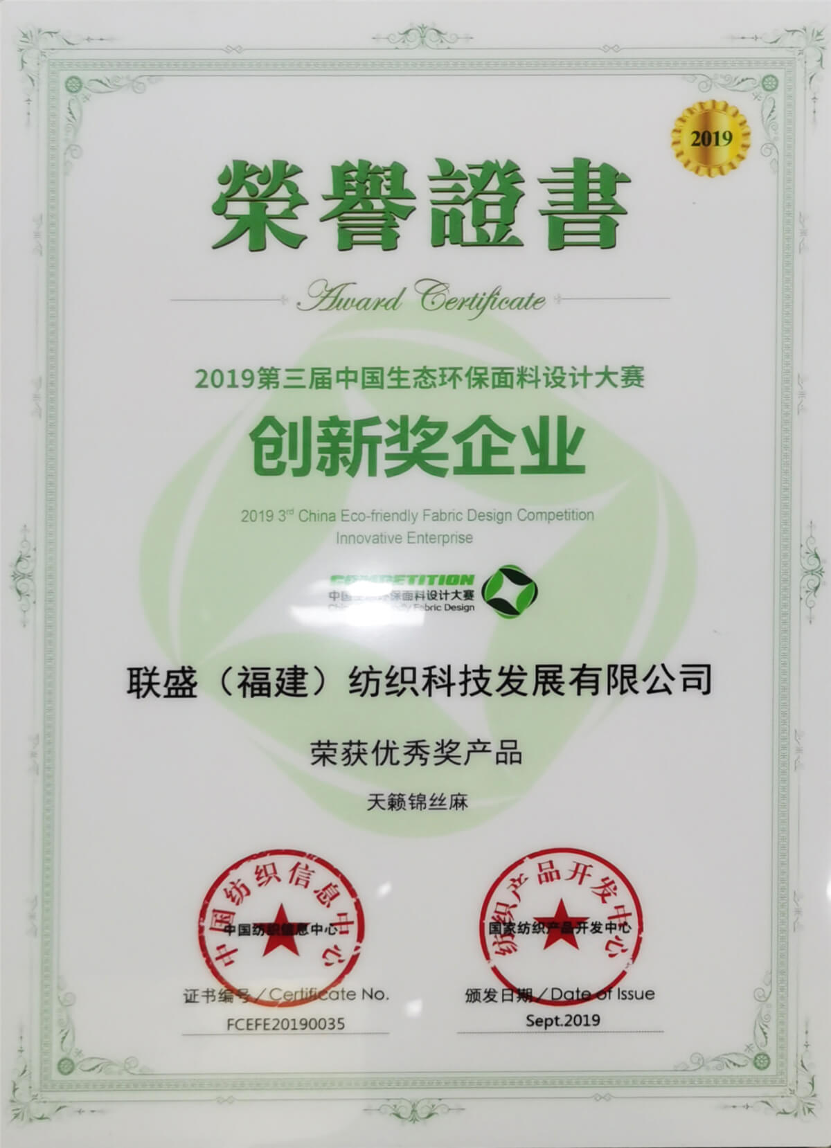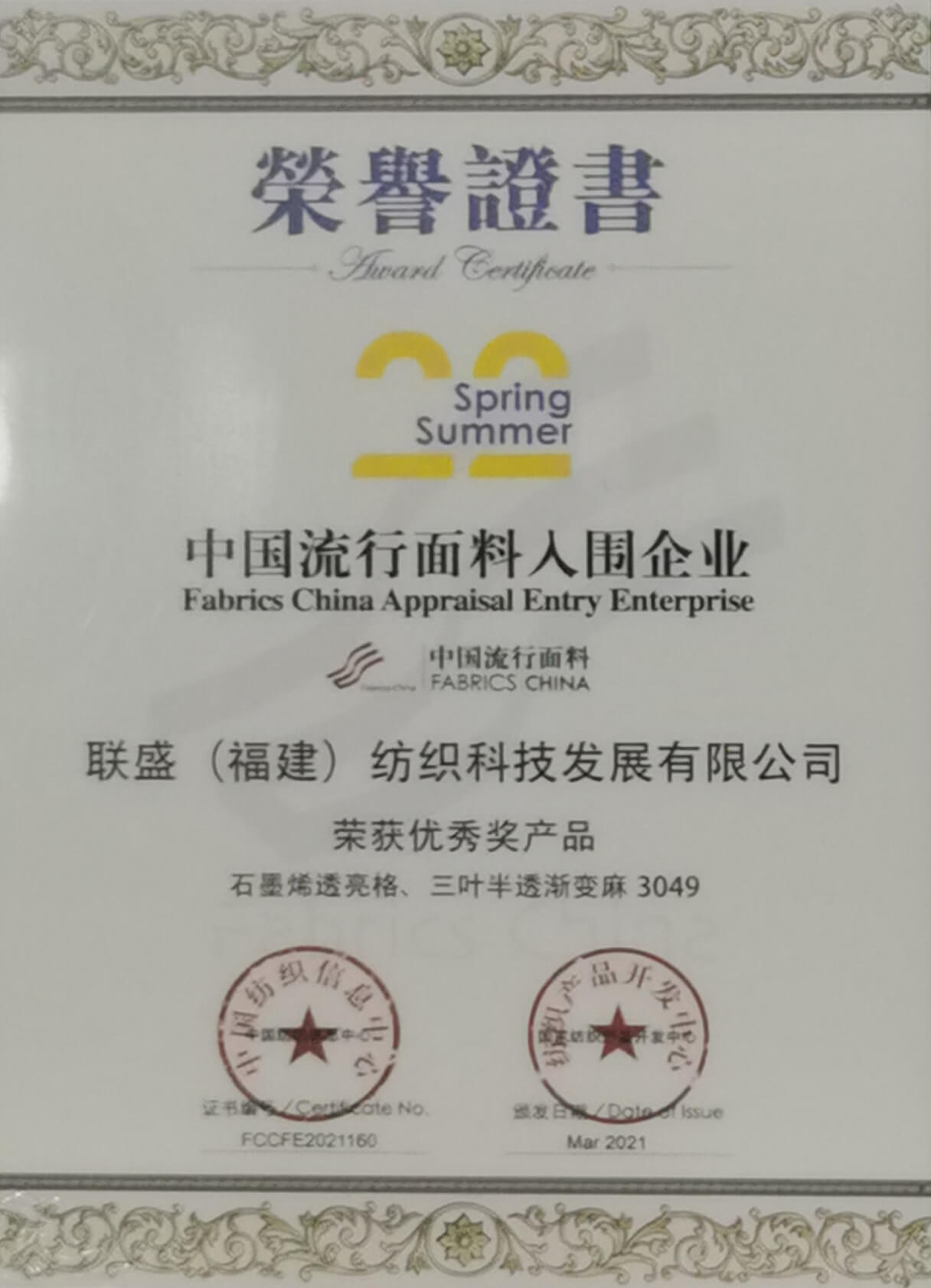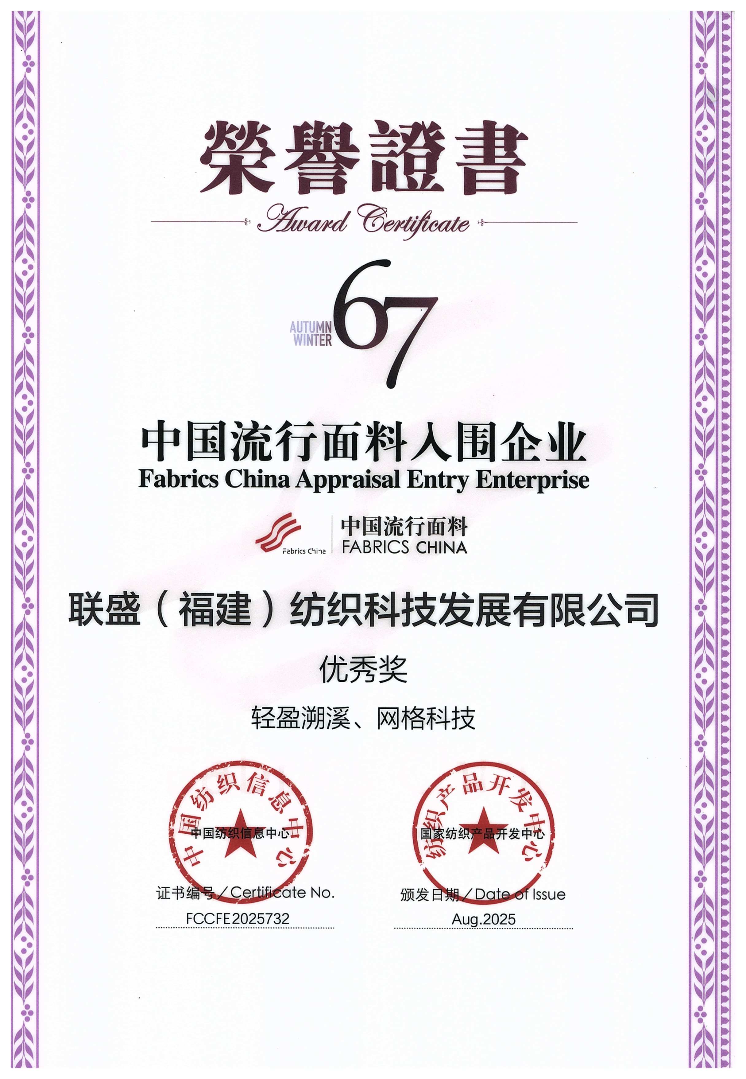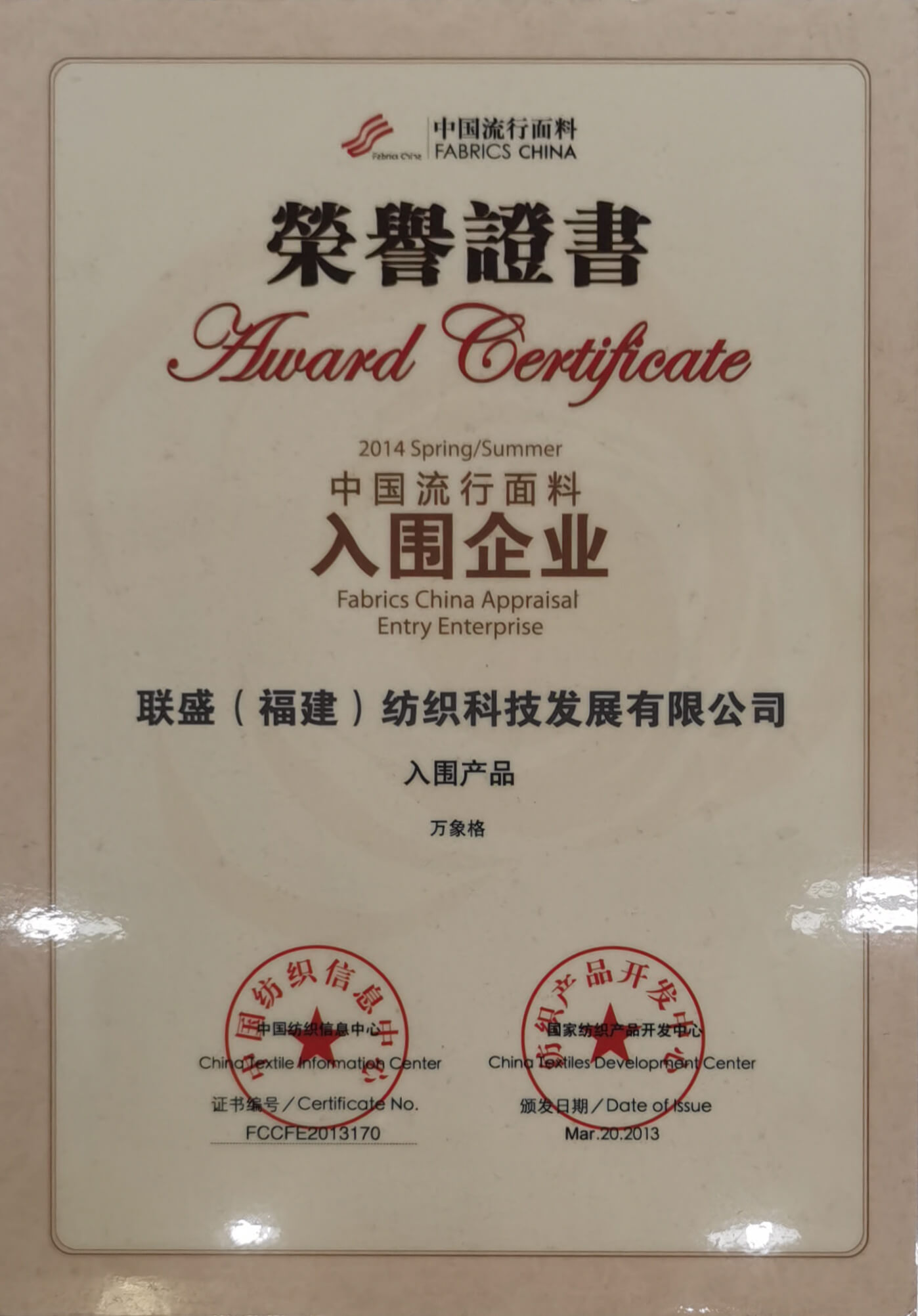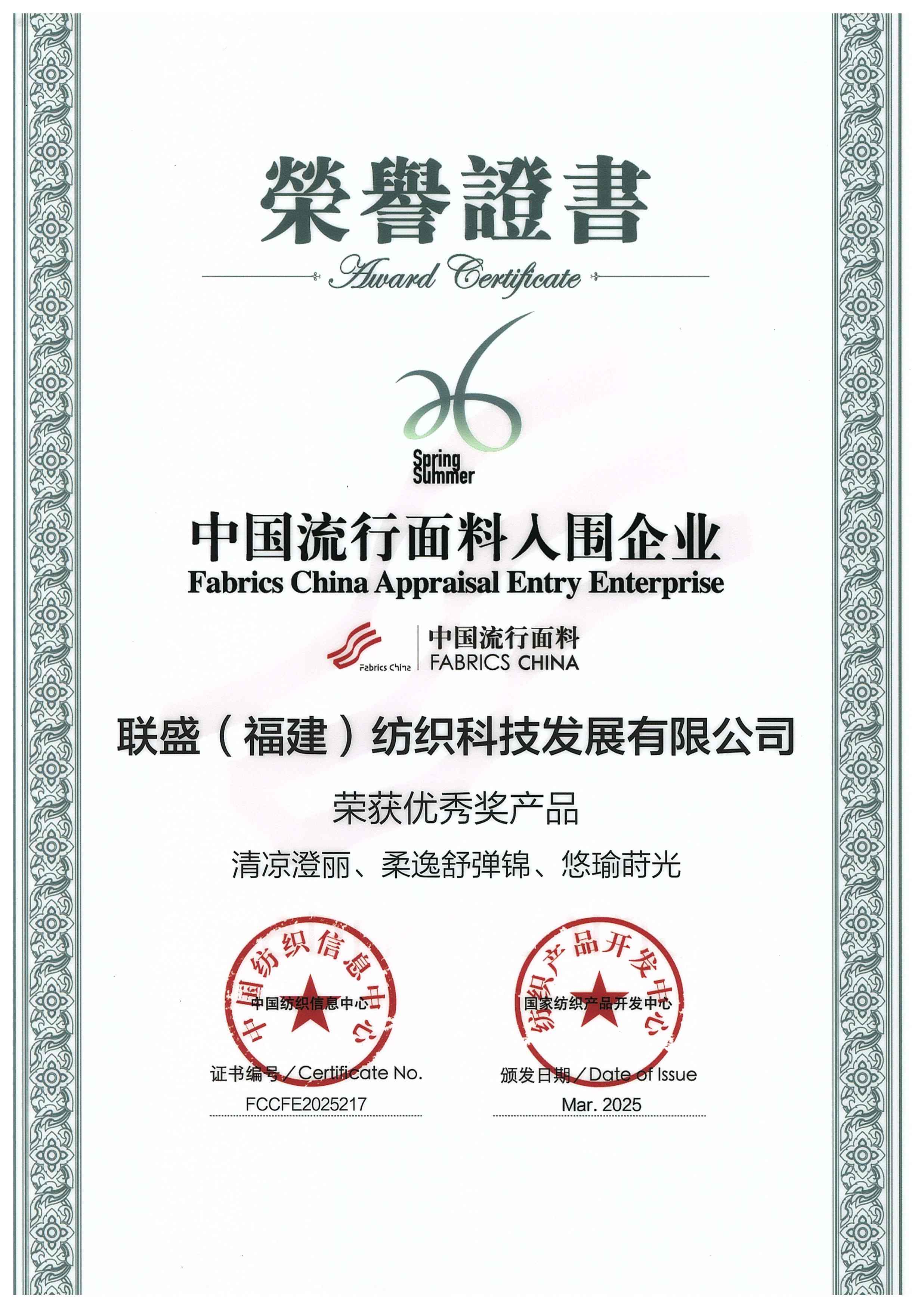 中國(guó)流行面料入圍企業(yè)優(yōu)秀獎(jiǎng)